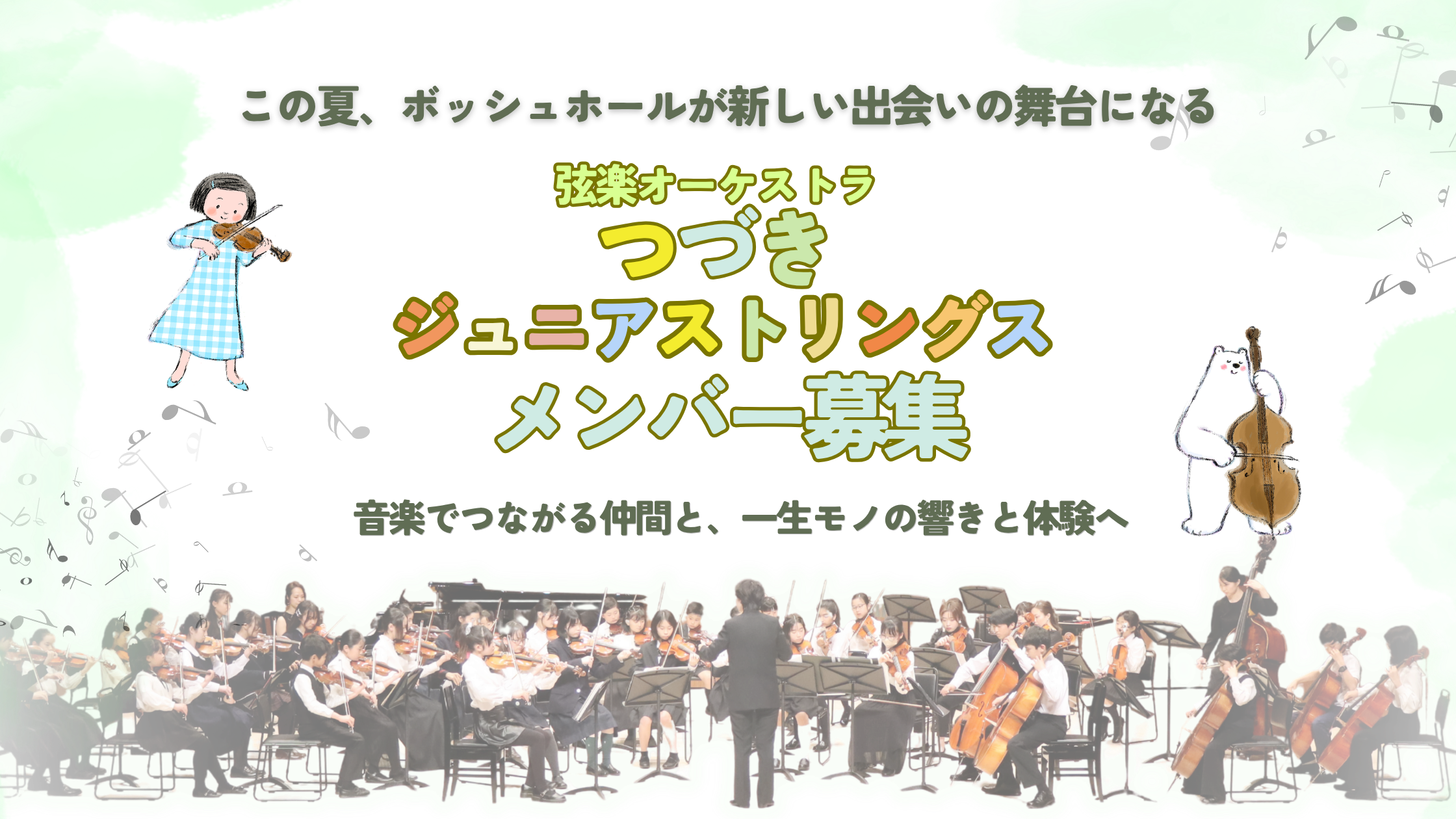 本年度も「つづきジュニアストリングス」夏の開催が決定しました。 今年の夏は、さらなるレベルアップを目指し プログラムをリニューアルボッシュホールの美しい響きと環境に加え 専用スタジオでの 「レベル×少人数」 の練習を新設 […] -