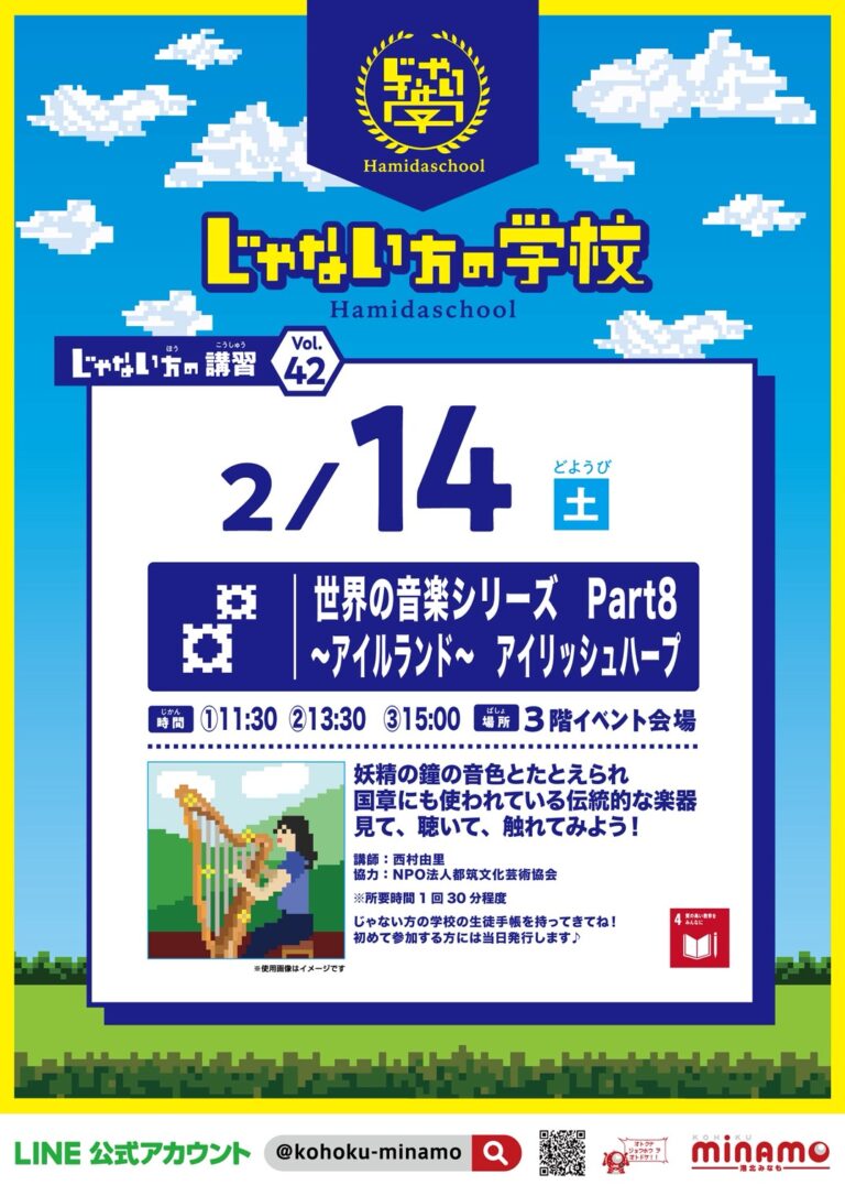 世界の音楽シリーズ Part8 〜アイルランド〜 アイリッシュハープ 2/14(土) 妖精の鐘の音色ともたとえられ、アイルランドの国章にも使われている伝統楽器 「アイリッシュハープ」 見て、聴いて、触れて、そのやさしくあ […] -